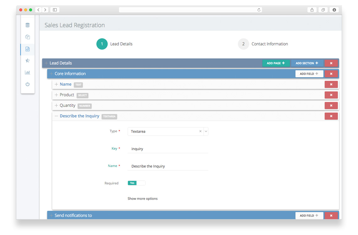Control how you input data into your forms using dropdown lists, text fields as well as quick select features such as radio buttons, multi-selects or true/false options. Use conditional logic to create sophisticated forms that can take specific paths, depending on answers to different field selections